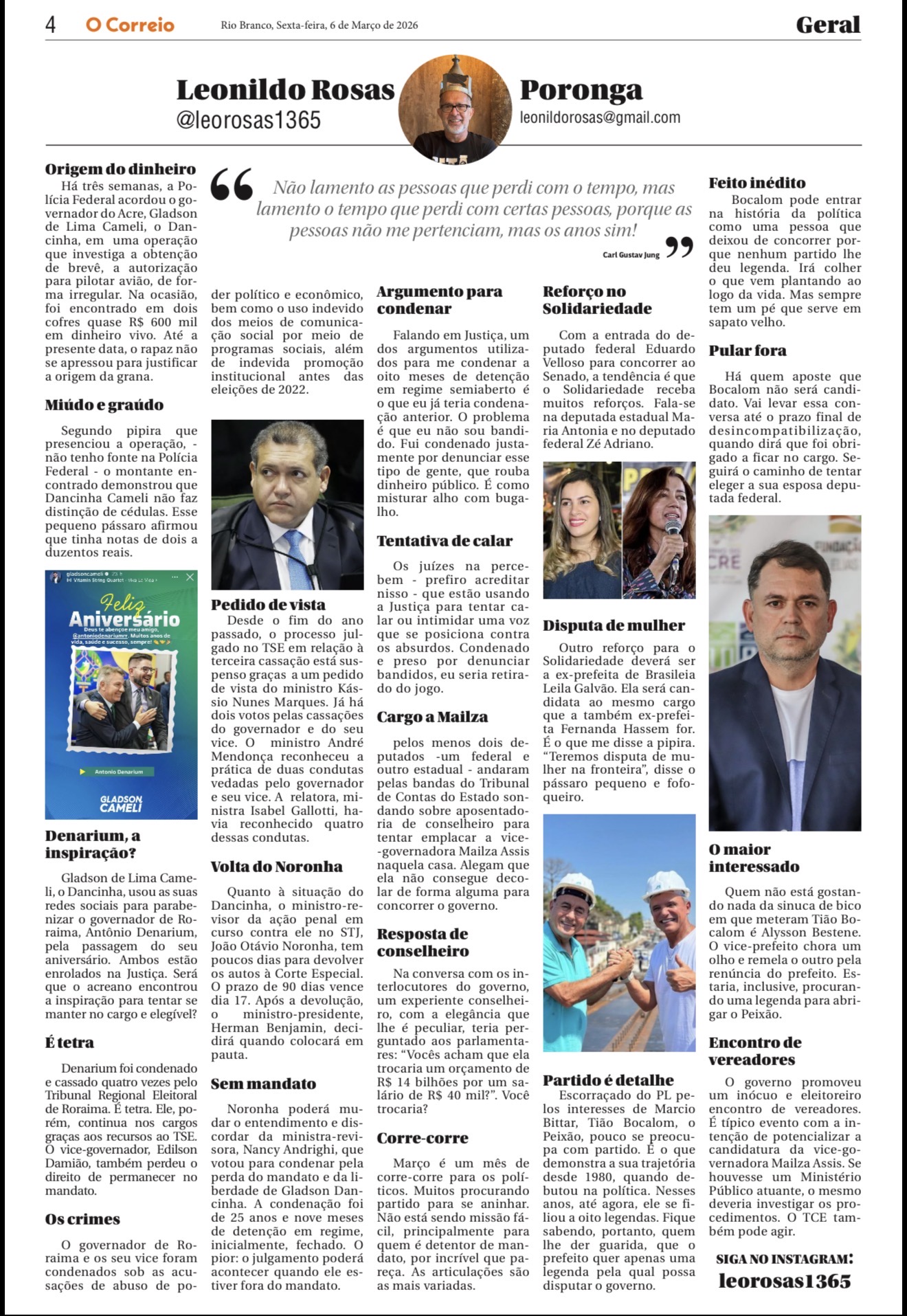 Há três semanas, a Polícia Federal acordou o governador do Acre, Gladson de Lima Cameli, o Dancinha, em uma operação que investiga a obtenção de brevê, a autorização para pilotar avião, de forma irregular. Na ocasião, foi encontrado em dois cofres quase R$ 600 mil em dinheiro vivo. Até a presente data, o rapaz não se apressou para justificar a origem da grana.