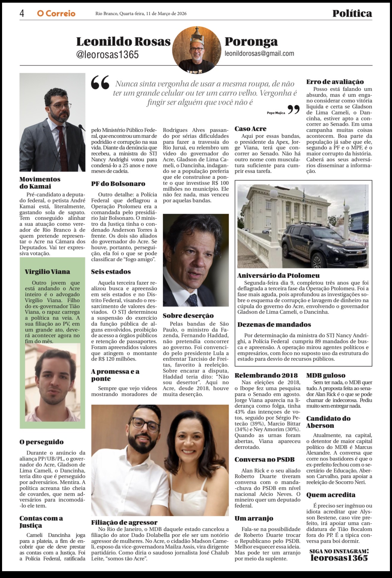 Pré-candidato a deputado federal, o petista André Kamai está, literalmente, gastando sola de sapato. Tem conseguido alinhar a sua atuação como vereador de Rio Branco à de quem pretende representar o Acre na Câmara dos Deputados. Vai ter expressiva votação.