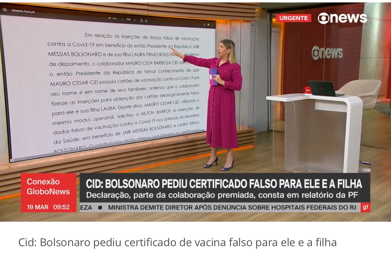 QUE o presidente [Bolsonaro], após saber que o COLABORADOR [Mauro Cid] possuía os cartões de vacina para si e sua família, solicitou que o COLABORADOR fizesse para ele também; QUE o ex-presidente deu a ordem para fazer os cartões dele e da sua filha […]; QUE o COLABORADOR solicitou a AILTON [Barros] que fizesse os cartões; QUE o COLABORADOR confirma que pediu os cartões do expresidente e sua filha […] sob determinação do ex-presidente JAIR BOLSONARO e que imprimiu os certificados; QUE solicitou a inserção de dados no sistema CONECTESUS de sua esposa, filhas, expresidente JAIR BOLSONARO e de sua filha, […];